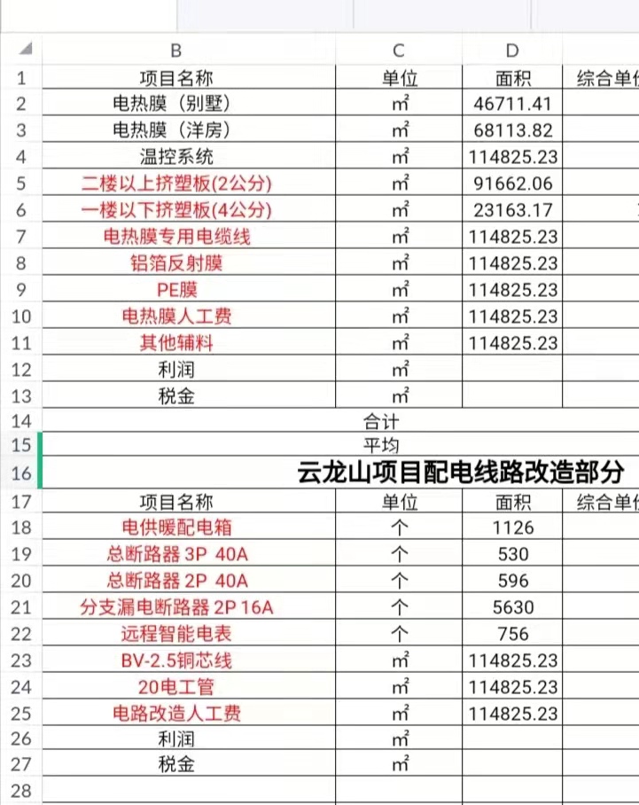徐州石墨烯電地暖云龍山項目工作內容:別墅總面積46000平方米安裝石墨烯電熱膜地暖,洋房總面積68000平方米安裝石墨烯電地暖,施工包含電熱膜、溫控系統(tǒng)、擠塑板、電熱膜專用電纜線及其他輔材等;另包含配電線路改造:電地暖配電箱、遠程智能電表、線管線材人工等;
